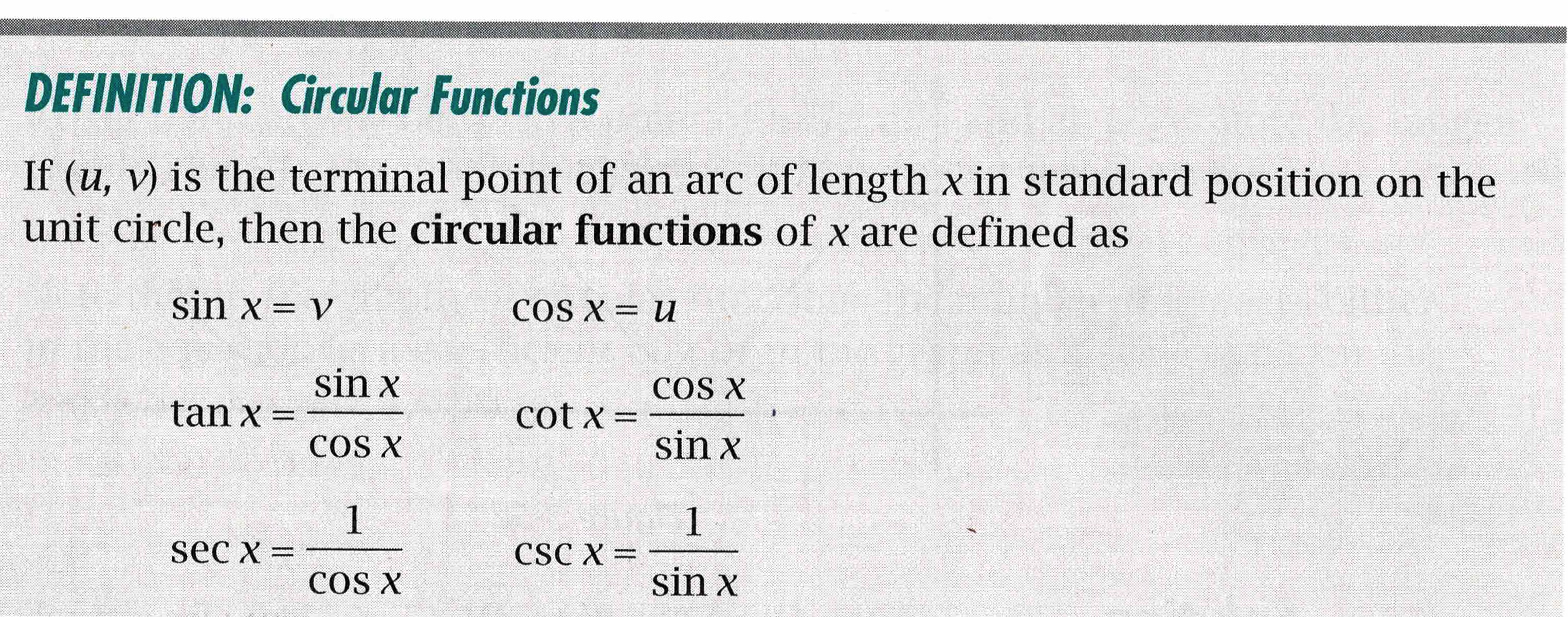 | p.117 Learn about the circular functions and their relationship to trigonometric functions. |