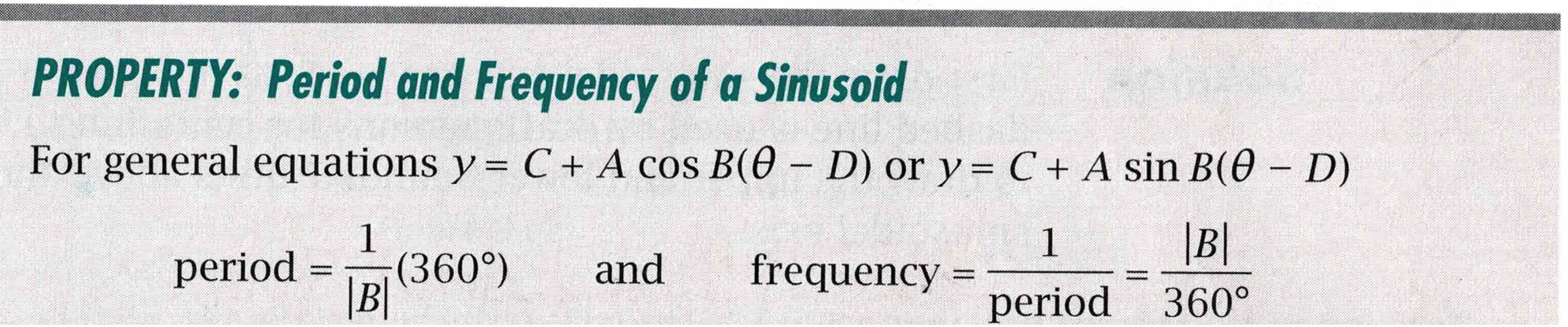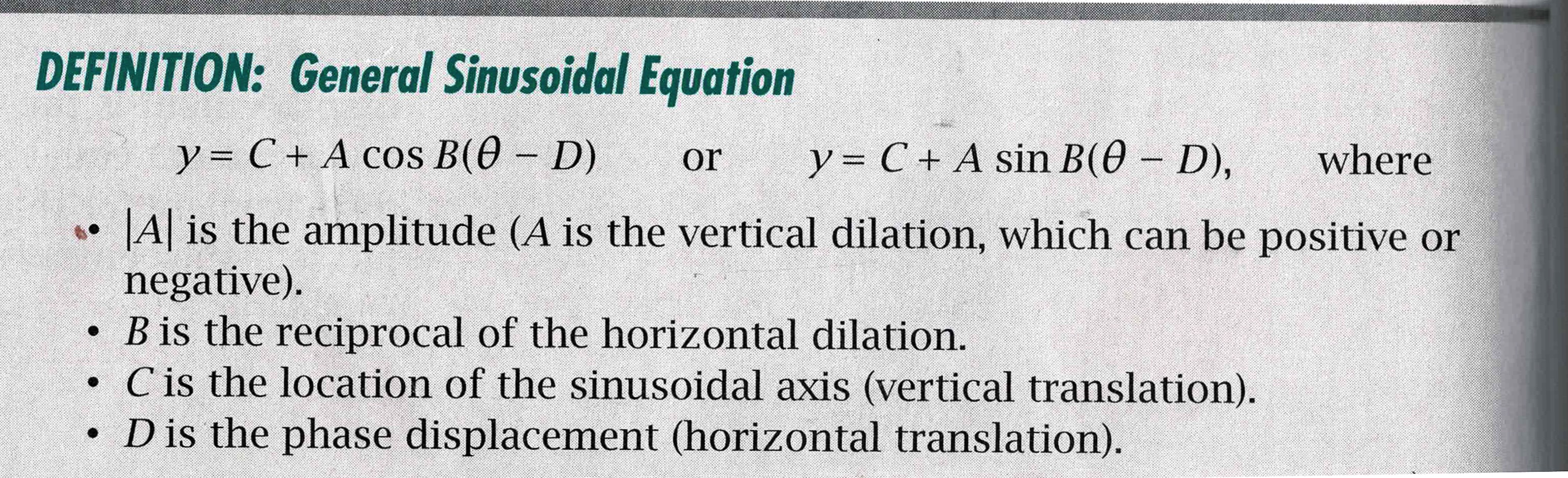 period, phase displacement, and cycle of a sinusoidal graph.